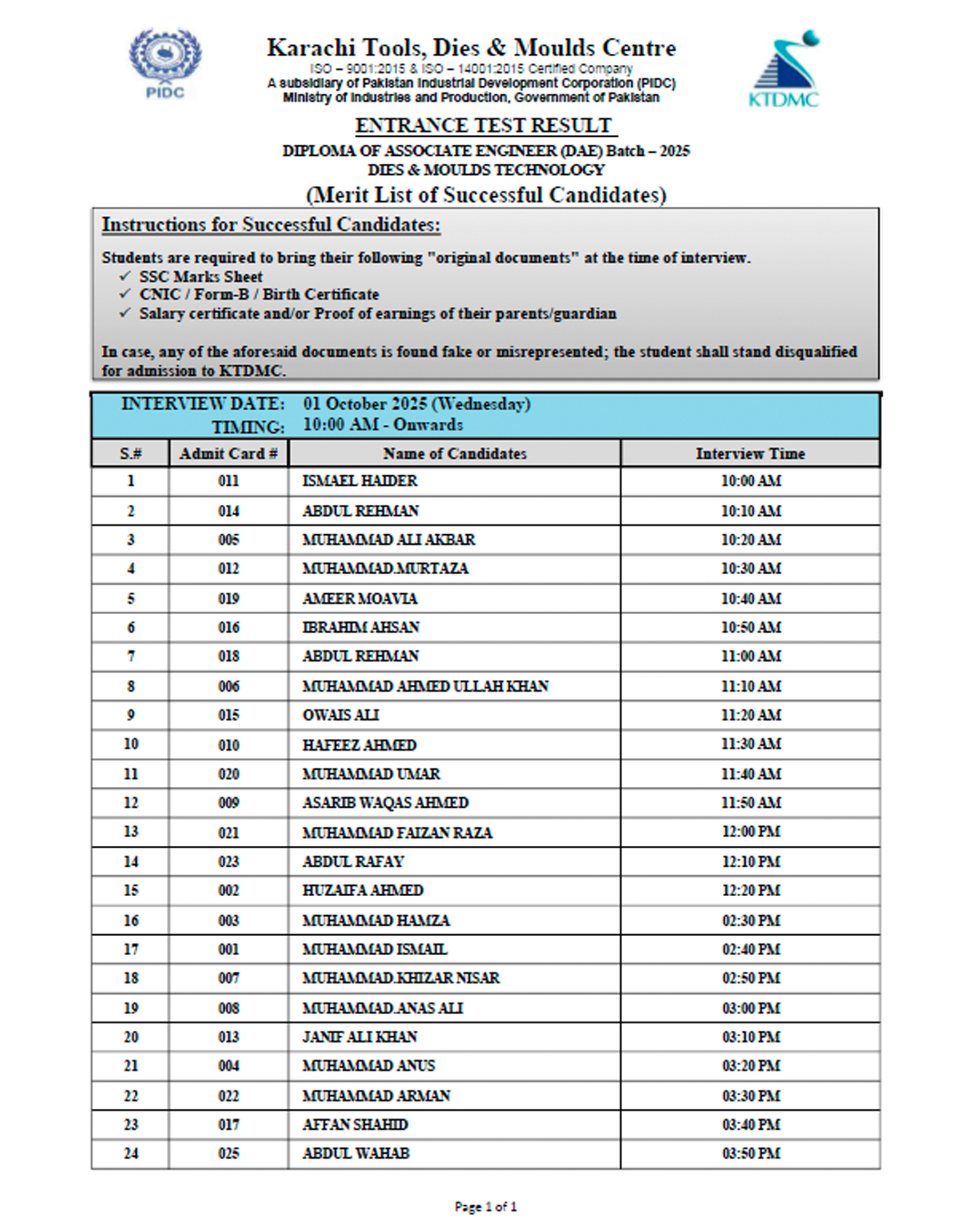 Merit List of Successful Candidates DAE Batch – 2025